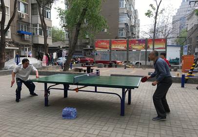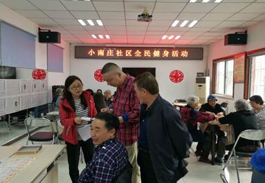 2018年4月19日两点半,小南庄社区分别在文化活动中心和文化活动广场开展了全民健身趣味运动,运动项目包括敲三家、象棋、麻将、乒乓球、踢毽子、投飞镖、老年软式网球,社区内142人参与了本次健身活动。