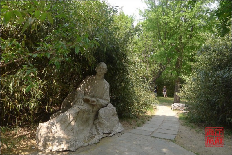 如今,园中立有汉白玉石雕座式曹雪芹塑像,手持古书,从容自若的坐卧于苍翠蓊郁、悠然恬静的院落中读书,让人见之便知曹雪芹先生当年于此读文著书的文人形象及生活环境。