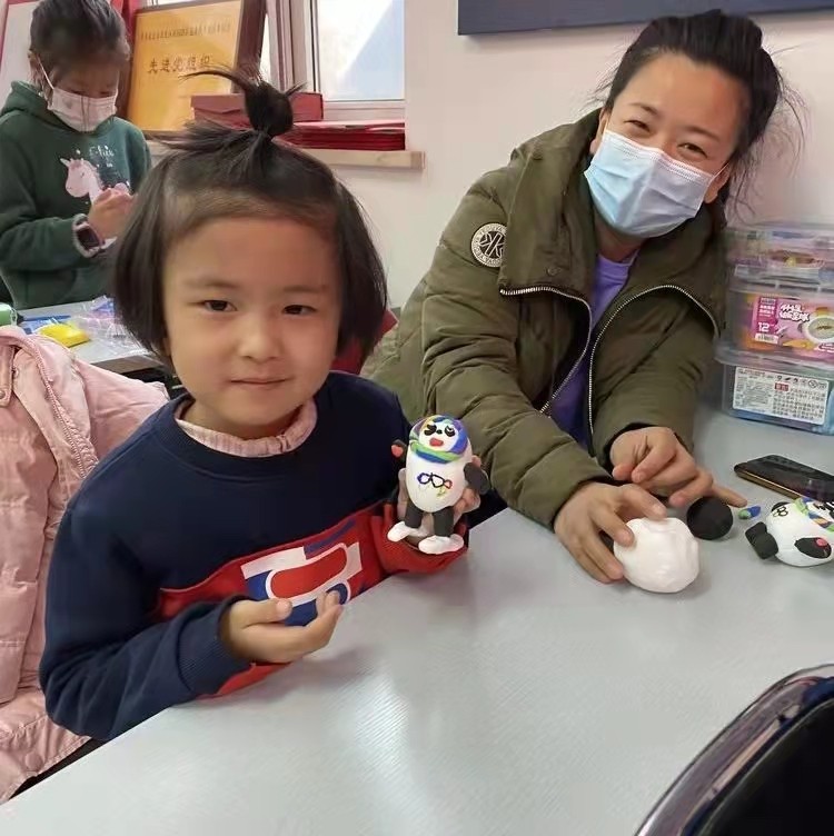 为带领孩子们共同了解冬奥,走进冬奥,社区工作人员带领孩子们用彩泥捏制北京冬奥会吉祥物——冰墩墩。工作人员为大家讲述冰墩墩的设计理念和寓意,讲解中说到冰墩墩的设计中融合了熊猫这个中国特色元素,也象征着奥林匹克精神,彰显了冬奥文化理念。孩子们用自己亲手捏制的冰墩墩为2022年北京冬奥会助力加油。